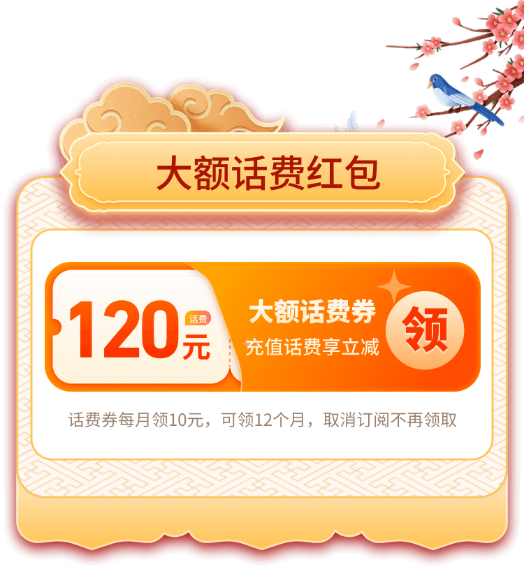 4、活动期间,用户首次在本页面成功开通服务,可额外获赠120元话费券(包含12张10元话费),每月限领1张,逾期不补。